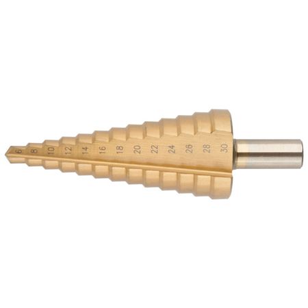 Назначение: по металлу Тип: ступенчатое Диаметр: 6-30 мм Тип хвостовика: трехгранный Материал: сталь быстрорежущая Покрытие сверла: TIN — нитрид титана