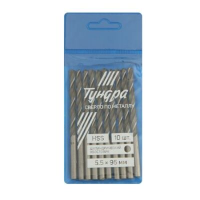 Сверло по металлу ТУНДРА, HSS, цилиндрический хвостовик, 5.5×95 мм, 10 шт.. Сверло по металлу с цилиндрическим хвостовиком ЛОМ предназначено для совместного использования с дрелью. Сверло применяется для сверления сквозных отверстий в металле. Цилиндрический хвостовик надежно фиксируется в патроне инструмента.