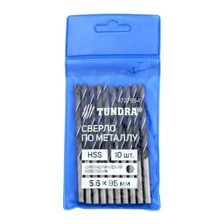 Сверло по металлу ТУНДРА, HSS, цилиндрический хвостовик, 5.6×95 мм, 10 шт.. Сверло с цилиндрическим хвостовиком предназначено для использования с дрелью. Изделие применяется для создания сквозных отверстий в металле. Цилиндрический хвостовик надежно фиксируется в патроне инструмента.
