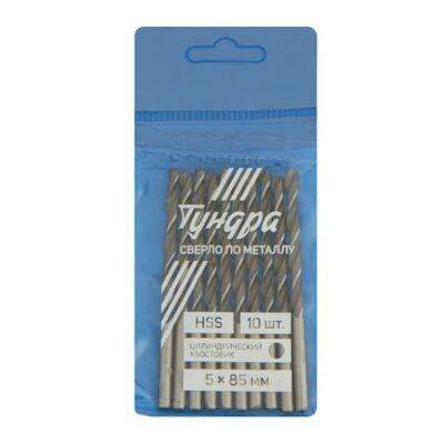 Сверло по металлу ТУНДРА, HSS, цилиндрический хвостовик, 5×85 мм, 10 шт.. Сверло с цилиндрическим хвостовиком предназначено для использования с дрелью. Изделие применяется для создания сквозных отверстий в металле. Цилиндрический хвостовик надежно фиксируется в патроне инструмента.