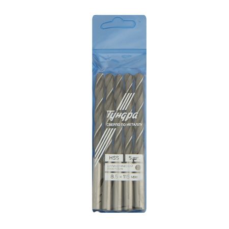 Сверло по металлу ТУНДРА, HSS, цилиндрический хвостовик, 8.5×115 мм, 5 шт.. Сверло с цилиндрическим хвостовиком предназначено для использования с дрелью. Изделие применяется для создания сквозных отверстий в металле. Цилиндрический хвостовик надежно фиксируется в патроне инструмента.