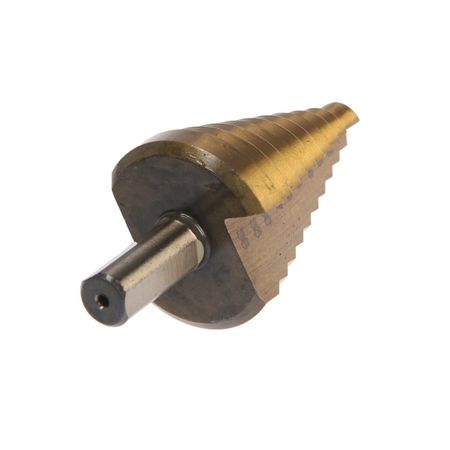 Сверло ступенчатое ТУНДРА, HSS, TiN, трехгранный хвостовик, 9 — 36 мм. Ступенчатое сверло с трехгранным хвостовиком предназначено для работ с дрелью. Изделие применяется для создания и рассверливания отверстий разного диаметра в цветном металле, листовой стали и твердом пластике. Для точности и удобства сверления на инструменте указано 15 диаметров сверла с расстоянием в 2 мм: 9, 10, 12, 14, 16, 18, 20, 22, 24, 26, 28, 30, 32, 34, 36 (мм). Специальное TiN-покрытие обеспечивает дополнительную износостойкость. В результате увеличивается срок службы и качество работы. Трехгранный хвостовик надежно фиксируется в патроне инструмента.