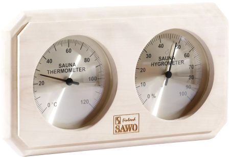 Термогигрометры бренда из Финляндии SAWO серии 221 оснащены двумя графичными циферблатами. Один измеряет степень влажности в помещении парной, второй покажет уровень температуры. Устройство изготовлено из осины и стекла, оно надежно защищено от повреждений. Прибор подходит для установки в любой бане или сауне.