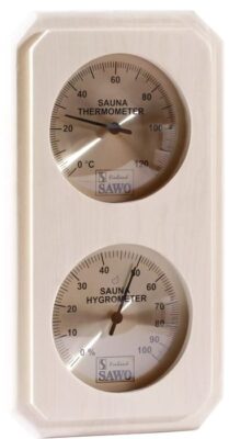 Термогигрометры бренда из Финляндии SAWO серии 221 оснащены двумя графичными циферблатами. Один измеряет степень влажности в помещении парной, второй покажет уровень температуры. Устройство изготовлено из осины и стекла, оно надежно защищено от повреждений. Прибор подходит для установки в любой бане или сауне.