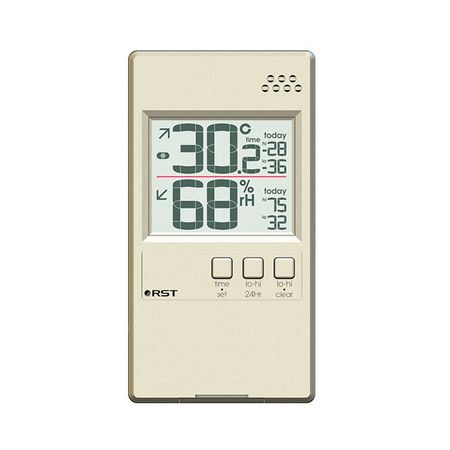 Цифровой термогигрометр с часами 01594 от известной компании Rst представляет собой ультратонкий (корпус имеет толщину в7 мм) и высокоточный прибор, предназначенный для замера температур, а также измерения показателя относительной влажности. Агрегат имеет удобное крепление с помощью присоски, благодаря чему будет прекрасно держаться на окне. Помимо температуры и влажности, устройство также показывает реальное время, может прогнозировать тенденции изменения температур. Корпус термометра окрашен в цвет шампань.