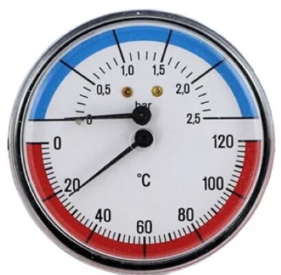 Термоманометр Watts (Ваттс) FR 818 (TMAX) 2,5 бар с осевым расположением штуцера и комплектуемым автоматическим запорным клапаном используется для комбинированного замера температуры и давления в отопительных системах, котлах. Полученные значения отображаются при помощи стрелки на цифровой шкале.