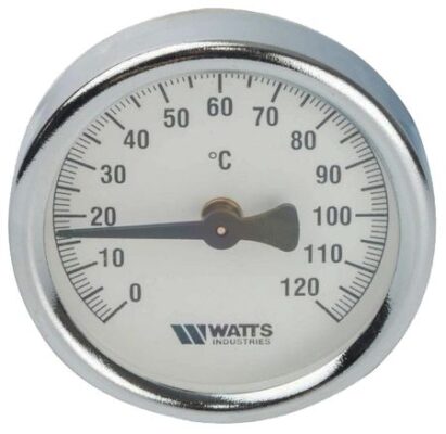 Термометр биметаллический накладной с пружиной Watts (Ваттс) FR810 (TAB) 80 мм. устанавливается непосредственно на трубу трубопровода системы отопления или водоснабжения и служит для информирования о температуре теплоносителя. Прибор имеет компактные размеры и широкий диапазон измерений, прост в установке и не требует обслуживания.