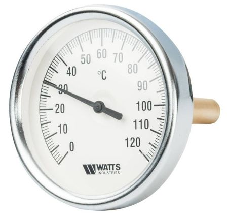 Термометр биметаллический с погружной гильзой Watts (Ваттс) F+R801 (T) 80/100 это специальный измерительный прибор, который в непрерывном режиме информирует потребителя о температуре воды в трубопроводе отопления или системы ГВС. В основе конструкции используется термочувствительный элемент, который взаимодействует с теплоносителем через погружную гильзу.