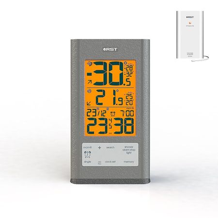 Цифровой термометр для дома RST 02719 с датчиком имеет подсветку дисплея. Используется для измерения температуры в помещении и на улице, определения тенденции и динамики изменения температуры, определения суточных максимального и минимального зарегистрированных значений температур. В данный бытовой прибор встроены часы с rcc сигналом, календарь и будильник, сигнализатор возникновения гололеда, индикатор состояния батареи станции и дистанционного радиодатчика.