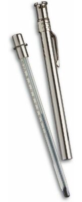Термометр TFA 14.1014 многоцелевой спиртовой, сделан из стекла и защищён металлической колбой-чехлом для измерения температуры воздуха по шкале Цельсия.