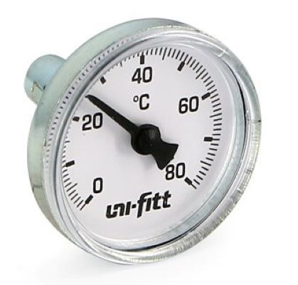 Биметаллический термометр Uni-Fitt (Уни-Фит) погружной аксиальный 80C, диаметр 40 мм отражает текущую температуру в трубах системы водоснабжения и отопления. Чувствительным элементом является биметаллическая спираль. Надежный корпус из никелированной стали защищает прибор от повреждений, а стекло на циферблате от загрязнений.