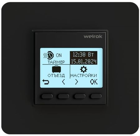 Welrok (Вэлрок) pro bk это компактный и функциональный терморегулятор, обладающий датчиками воздуха (встроен) и пола (поставляется в комплекте), что позволяет ему одновременно контролировать работу теплых полов и обогревателей. На лицевой панели корпуса расположен яркий ЖК-дисплей и кнопки настройки.