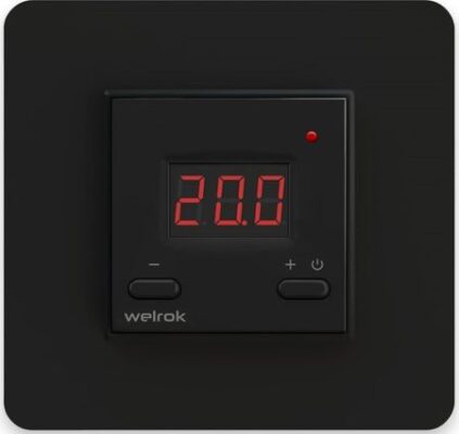 Welrok (Вэлрок) vt bk представляет собой эргономичный терморегулятор, при помощи которого можно контролировать работу электрических систем отопления (всевозможных обогревателей и конвекторов). На переднюю панель регулятора вынесены кнопки для настройки и дисплей, отображающий актуальную температуру. Цвет корпуса черный.