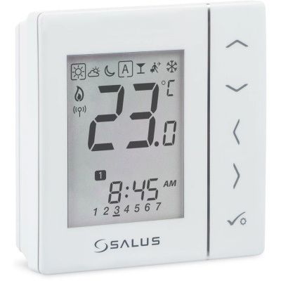 Беспроводной комнатный термостат Salus (Салус) VS20WRF оснащен дисплеем и понятным управлением с помощью сенсорных клавиш. Представленная модель имеет компактный, но прочный корпус в белом цвете. В случае потери электропитания все настройки работы прибора сохранятся благодаря внутренней памяти.