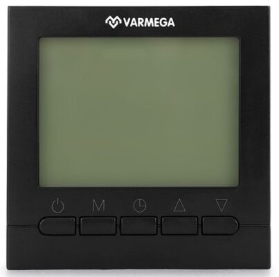 VARMEGA (Вармега) VM19222 230 В это компактный настенный термостат электронного типа. Модель изготовлена в пластиковом корпусе черного цвета, на передней панели расположены кнопки для настройки температуры, а также небольшой дисплей, отображающий выставленные данные. По умолчанию в термостат встроен датчик температуры, но опционально к нему можно подключить выносной.