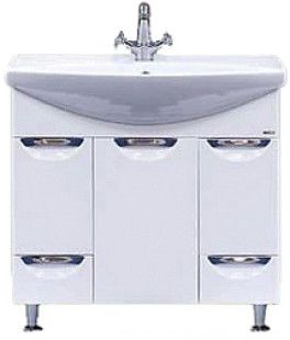 Широкая тумба оригинальной конструкции – с двумя нижними выдвижными ящиками и несколькими отсеками, закрытыми тремя распашными дверцами. Модель оборудована качественной белой раковиной Лагуна.