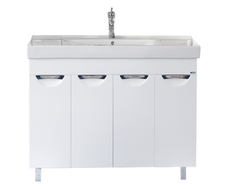 Устанавливаемой на хромированные ножки тумбой в комплекте с большой, удобной керамической раковиной-столешницей. В шести выдвижных ящиках и отделении с двустворчатыми дверками и можно комфортно хранить различные используемые в ванной комнате предметы.