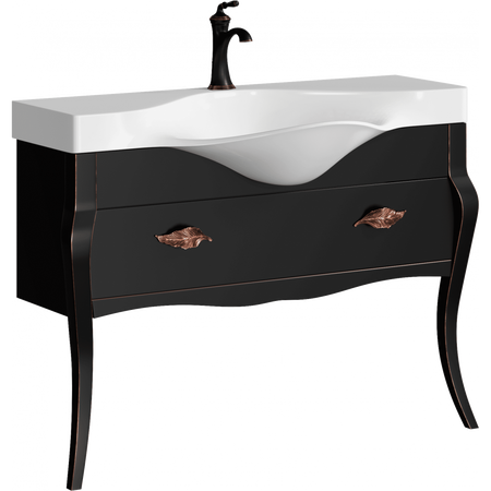 Комбинированная тумба под раковину Aqwella Clarberg Borgia 115 BOR0111BLK с одним ящиком выполненная в духе современной классики, отличается утонченными и изящными формами, которые подчеркивает патина под медь. Ручки в виде листьев эффектно дополняют образ мебели. Ящик тумбы оборудован системой полного выдвижения LegraBox австрийской фирмы Blum.