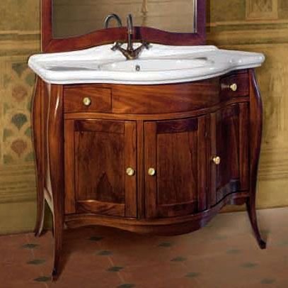 Мебель серии Ferrara выдержана в романтическом классическом стиле и изготовлена из натурального дерева в цвете noce и tinta moka. Тумба укомплектована широкой керамической раковиной, оборудована двумя выдвижными ящичками и тремя распашными дверками. Все распашные и выдвижные фасады украшены комплектом ручек в цвете бронза.