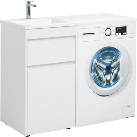 Напольная тумба с раковиной Aquanet Токио 120 L белого цвета представляет новый формат тумб производства Aquanet. Раковина из литьевого мрамора имеет длинную платформу, которая выходит далеко за пределы тумбы. Она предназначена для того, чтобы установить с правой стороны от тумбы стиральную машину. Платформа имеет такую длину, которая позволит спрятать под нее машинку средних размеров с фронтальной загрузкой. Корпус тумбы выполнен из влагостойкого ЛДСП, а фасады – из МДФ с покрытием эмалью. Две зоны хранения в тумбе шириной 580 мм — это выдвижной ящик с доводчиками для хранения важных мелочей и откидная дверка с закрепленной на ней бельевой корзиной. Тумбу можно использовать и без соседства со стиральной машиной, а свободное пространство под платформой раковины занять подкатной тумбой, приспособлениями для уборки помещения или столиком.