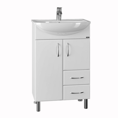 Хорошим дополнением к современному гарнитуру станет тумба универсального белого цвета СанТа Уют 55. Конструкция подразумевает 2 ящика и 2 дверцы, за которыми находятся отсеки для размещения бытовой химии и хозтоваров. Модель предусматривает установку на опорные регулируемые ножки, которые помогут увеличить высоту тумбы на 16 мм. Для защиты фасада от брызг и расслаивания сверху нанесена пленка ПВХ методом мембранно-вакуумного прессования.