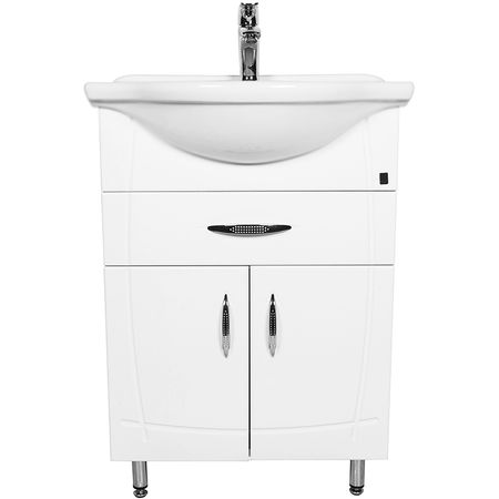 Тумба с раковиной на ножках Orange Софи 60 Si-60TU+RA с двумя распашными дверцами и одним выдвижным ящиком. Предназначена для использования в ванных комнатах с повышенной влажностью. Белый глянцевый фасад с оригинальной фрезой закругленными линиями и изящные ручки прекрасно сочетаются. Большая вместительность при умеренных габаритах. Демократичная цена.