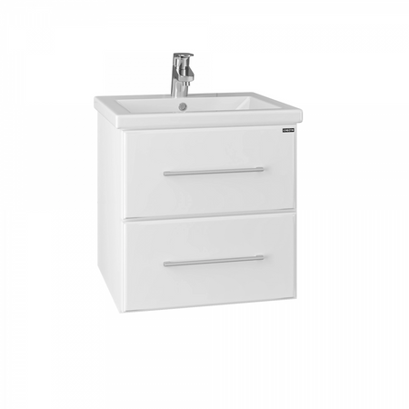 Тумба + раковина СаНта Омега 50 207035л, подвесная, цвет белый (2 ящ.) Основные характеристики: Тумба: 46*53*38 см Материал: ВДСП с ламинированным покрытием и МДФ Покрытие: пленка ПВХ Цвет: белый Петли с доводчиками, плавное закрывание Ящики полного выдвижения