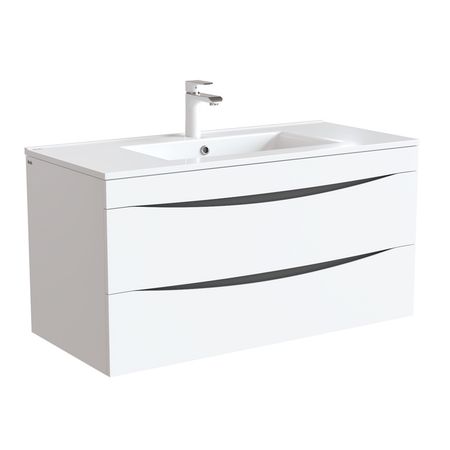 Тумба с умывальником для ванной комнаты, подвесная. Размеры тумбы без умывальника: 455х1003х500 мм (ДхШхВ). Размеры умывальника: 465х1000х175 мм (ДхШхВ). Фасад МДФ 19 мм в эмали (белая), фрезеровка. Корпус влагостойкий ЛДСП 16 мм в эмали. Интегрированные ручки. Два выдвижных ящика с механизмом плавного доведения. Пластиковый ограничитель под сифон в верхнем ящике. Перекатной организатор в нижнем ящике. Навесы усиленные с планкой.