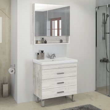 Напольная тумба-умывальник с тремя выкатными ящиками. Ящики оснащены доводчиками для плавного закрывания. Корпус и фасады тумбы из влагостойкого ДСП актуальной фактуры "Дуб белый" с имитацией натурального дерева. Тумба укомплектована прямоугольной раковиной самарского завода из 100% санитарного фарфора.