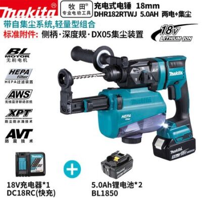 Ударная дрель Makita DHR182RTWJ + два аккумулятора 5.0Ач, зарядное устройство, комплект для сбора пыли DX05