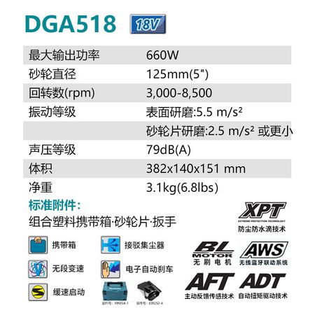 Угловая шлифовально-полировальная машина Makita DGA518, 125 мм + два аккумулятора 3.0Ah, зарядное устройство