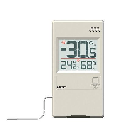 01595 от производителя Rst — стильное решение для замера и прогнозирования уличных и комнатных температур. Термогигрометр выполнен из прочного материала и имеет цвет слоновой кости. Также данный прибор оснащен множеством добавочных функций, включающих в себя возможность запоминания максимальных и минимальных суточных температур. Устройство способно сделать прогноз изменений температурного режима, измерить относительный уровень влажности, предупредить об образовании гололеда. Агрегат размещается внутри помещения, а все замеры на улицы производятся с помощью выносного термосенсора.