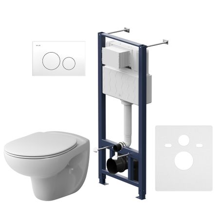 Полностью готовый к установке комплект: система инсталляции с клавишей, подвесной унитаз с сиденьем. Неразборная рама из стального профиля выдерживает нагрузку до 400 кг. Полностью изолированный бачок с качественной двухрежимной смывной арматурой — комфортное использование благодаря низкому уровню шума — менее 20 Дб. Укомплектован пневматической клавишей в белом цвете. В комплекте все необходимые патрубки и крепления, а также прокладка между унитазом и стеной — звукоизоляция.