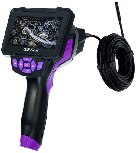 Ermenrich Seek VE70 это цифровой технический эндоскоп, предназначенный для визуального обследования мест с затрудненным доступом, будь то узлы механизмов, сантехнические трубы, стеновые конструкции, кузова автомобилей и так далее. Оснащенный 2 HD-камерами (фронтальной и боковой) на конце полужесткого кабеля длиной 10 м, прибор выводит изображение на большой цветной ЖК-экран с разрешением 1080p в реальном времени.Камеры обладают широким углом обзора, для освещения используются диоды. Картинку с камеры на камеру можно быстро переключить одной кнопкой, также изображение можно зафиксировать на экране. Линзы и осветители эндоскопа имеют влагозащиту по стандарту IP67, допускается недолгое погружение зонда в воду на небольшую глубину.Устройство можно использовать как рекордер, для этого в корпусе есть разъем для карты microSD объемом до 64 ГБ, на которую сохраняются фото и видео в разрешении 720p и 480p соответственно. Карту памяти необходимо приобрести самостоятельно. У эндоскопа есть встроенный аккумулятор, способный поддерживать 3 часа автономной работы на полном заряде. Отслеживать расход питания можно с помощью индикатора на экране прибора.В комплекте с Ermenrich Seek VE70 идут насадки для зонда (крюк, магнит, защитный колпачок) и кабель microUSB для зарядки. Что немаловажно, эндоскоп успешно выполняет свою работу в широком диапазоне температур: от 10 до 75 С.Основные особенности: Фронтальная и боковая HD-камеры с осветителями на конце 10-метрового кабеляБольшой цветной ЖК-экран с разрешением 1080pВлагозащита линз и диодов IP67Запись фото и видео на карту памяти microSDПитание от аккумулятора (до 3 ч автономной работы), индикатор зарядаХарактеристики: Тип: промышленный Дисплей: LCD, цветной Диагональ дисплея, дюйм: 4.3 Разрешение дисплея, пикс: 1920×1080 Количество камер: 1 боковая, 1 фронтальная Угол обзора камеры, : 70 (фронтальная), 70 (боковая) Диаметр камеры, мм: 8 (фронтальная), 4 (боковая) Осветитель камеры: 6 диодов Вспомогательный осветитель боковой камеры: да Фокусное расстояние, мм: 40 5000 Встроенный рекордер: да Формат файлов фотосъемки: *.jpg Разрешение фото, пикс: 1280×720 (720p) Формат файлов видеозаписи: *.avi Разрешение видео, пикс: 640×480 (480p) Водозащищенность: IP67, полная защита от пыли, кратковременная водонепроницаемость (линзы и светодиоды) Карта памяти: класс 10, microSD до 64 ГБ (не входит в комплект) Длина кабеля, м: 10 Диапазон рабочих температур, С: -10…75 Источник питания: 1700 мАч литий-ионный аккумулятор, 5 В, 1 А (нет в комплекте) Ресурс работы батареи, ч: 3Комплектация:ВидеоэндоскопКрюкМагнитЗащитный колпачокКабель microUSBИнструкция по эксплуатации и гарантийный талон