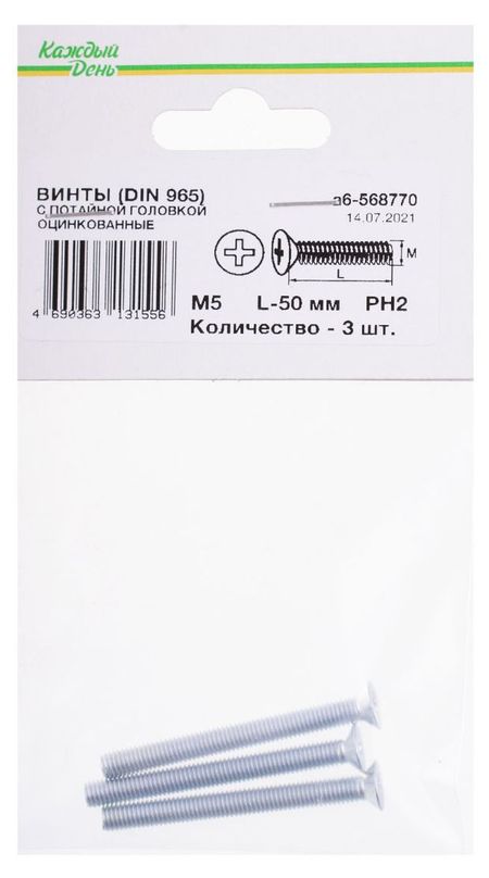 Винт Din 965 Каждый день с потайной головкой М 5×50 оцинкованный, 3 шт