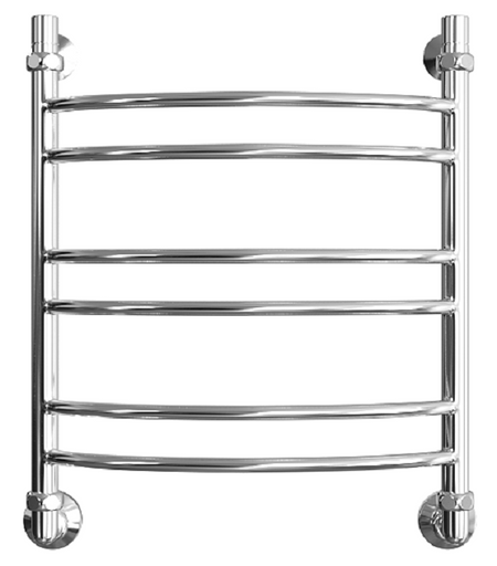 Полотенцесушитель Двин L (1 — 1/2) 60/50 собран из стоек и дуг, при чем дуги располагаются по группам в несколько штук между ними. При различных вариантах неточностей, возникающих при монтаже агрегата, детали, крепежа, поступающие в комплектации позволяют их компенсировать посредством регулирования расположения в ту или же иную сторону от стены.
