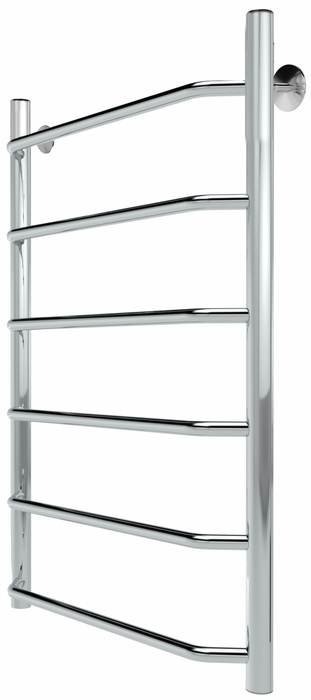 INDIGO (Индиго) Roof б/п (в.р.1/2) 80/50 Полиров. это водяной полотенцесушитель лесенка с горизонтальными выпуклыми перекладинами. Все трубы в нем имеют круглое сечение, что в сочетании с хромированной расцветкой делает модель изящным украшением интерьера ванной комнаты. Материал изготовления нержавеющая сталь.