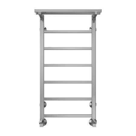 Модель "Контур с полкой" относится к линейке в стиле хай-тек, тяготеющей к лаконичным формам и хромированным поверхностям, и отличается наличием дополнительной прогреваемой полки для хранения и сушки полотенец.