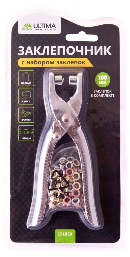 Заклепочник с набором заклепок предназначен для установки заклепок в предварительно вырубленные отверстия в изделиях из кожи, брезента и плотных тканей.