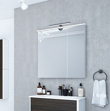 Предлагается широкая линейка зеркальных шкафов. Они снабжены выключателем и розеткой; светильник (такой же как в зеркале) включен в комплектацию. Cтворки установлены на петли со встроенными доводчиками, которые закрываются бесшумно.