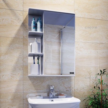 С зеркалом-шкафом СанТа Ника 50 косметические и гигиенические средства будут всегда под рукой. Модель состоит из малого бокового зеркала с тремя открытыми полками и основного полотна на распашной дверце. Помимо того, что изделие компактно, оно обладает хорошей вместимостью и поможет аккуратно расставить необходимые принадлежности. Чтобы обеспечить максимальную влагозащиту, фасад покрыт матовой ПВХ-пленкой. Фацетная огранка придает обработанному краю зеркала презентабельный вид и визуально расширяет пространство.