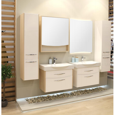 ИНФИНИТИ – стильная лаконичная модель, которая прекрасно впишется в ванную комнату любого размера. Выпускается в нескольких цветах — традиционном белом и популярном цвете ясень коимбра. В подвесной тумбе два ящика, фасадные линии которых повторяют чашу раковины и лицевой фурнитуры. По желанию тумбу можно комплектовать вместительным зеркальным шкафом или изящным зеркалом. Зеркало снабжено led подсветкой и выключателем. За фигурным фасадом зеркального шкафа расположены, регулируемые по высоте, стеклянные полки. Все ящики снабжены системой плавного закрывания. Мебель украшают изящные ручки бельгийского производителя METAKOR. Комплектация навесы — 2; выключатель — 1