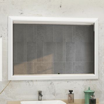 Широкое зеркало для ванной комнаты из коллекции Империя. Рама из МДФ окрашенного белой глянцевой эмалью. Фацет на зеркальном полотне и раме повторяется на выдвижных ящиках тумбы-умывальника.