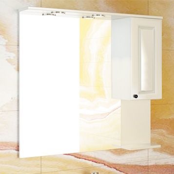 Зеркало со шкафом и верхней полкой с двумя светильниками и выключателем. Створка открывается вправо и оснащена петлями с плавным закрыванием. За створкой одна полка. Высококачественное зеркальное полотно с амальгамой на основе серебра. Фасад из МДФ окрашен глянцевой эмалью цвета слоновая кость.