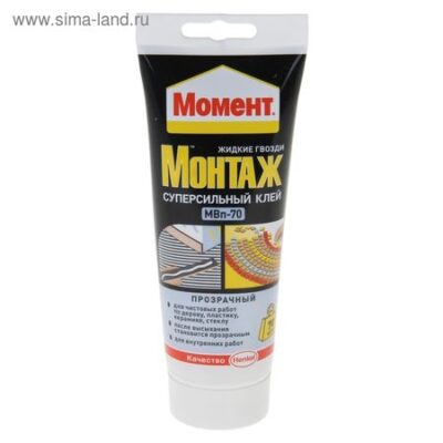 Клей «Момент» является достойным аналогом обычных гвоздей, шурупов и дюбелей. Продукт изготовлен на основе полиакрилат-водной дисперсии. Преимущества:водостойкий; прозрачный; время для изменения положения деталей: 15 минут; без запаха (не содержит растворителей); отлично подходит для чистовых и декоративных работ, в том числе с использованием стекла; сила схватывания в момент приклеивания: 70 кг/м².