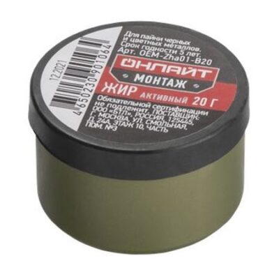 Главная » Строительство и ремонт жир паяльный ОНЛАЙТ активный 20г Просмотров 11 Объем : 20 гр Тип: активный Упаковка : банка ОНЛАЙТ