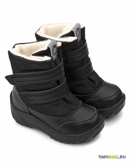 Ботинки для маленьких мальчиков на подкладке из шерстяной байки. Универсальная, практичная модель. Выполнены из натуральной кожи и плотного текстиля чёрного цвета. Два ремешка с липучками позволяют отрегулировать модель по полноте. Многослойная, анатомическая стелька для правильного формирования стопы. Устойчивая, высокая подошва с протектором, имеющая перекат, позволяет повторить естественное движение стопы при ходьбе для правильного распределения нагрузки на опорно-двигательный аппарат ребенка. Подошва закрывает часть носка и пятки, что дополнительно защищает модель от промокания в сырую погоду. Подкладка из шерстяной байки поддерживает комфортную температуру внутри обуви при погодных условиях от + 5 до -5 градусов. Язычок выполнен в виде клапана и украшен светоотражающим логотипом.