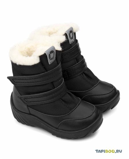 Ботинки для маленьких мальчиков на подкладке из шерстяного меха (овечий чёс на трикотажной основе). Универсальная, практичная модель. Выполнены из натуральной кожи и плотного текстиля чёрного цвета. Два ремешка с липучками позволяют отрегулировать модель по полноте. Многослойная, анатомическая стелька для правильного формирования стопы. Формоустойчивый задник, средней жёсткости. Устойчивая, высокая подошва с протектором, имеющая перекат, позволяет повторить естественное движение стопы при ходьбе для правильного распределения нагрузки на опорно-двигательный аппарат ребенка. Подошва закрывает часть носка и пятки, что дополнительно защищает модель от промокания в сырую погоду. Подкладка из шерстяного меха поддерживает комфортную температуру внутри обуви при погодных условиях от — 5 до -15 градусов (пожалуйста учитывайте подвижность ребёнка). Язычок выполнен в виде клапана и украшен светоотражающим логотипом.