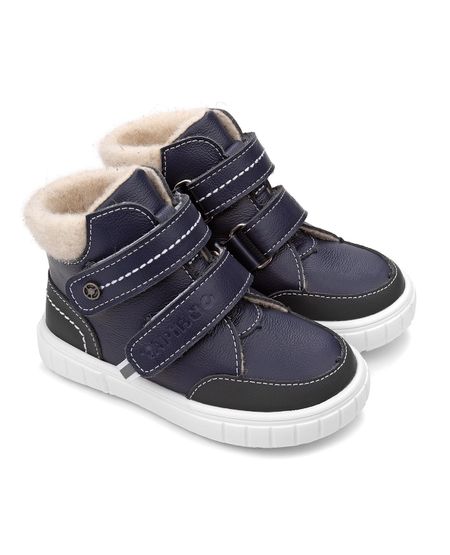 Утепленные ботинки на осень, тёплую зиму или весну для маленьких мальчиков на подкладке из шерстяной байки. Выполнены из натуральной кожи универсального тёмно-синего цвета. На носке и пятке — кожа с гидрофобным покрытием. Современная, устойчивая, упругая и эластичная подошва позволяет повторить естественное движение стопы при ходьбе для правильного распределения нагрузки на опорно-двигательный аппарат ребенка. Многослойная съемная стелька с небольшим мягким подсводником и подпяточником для правильного формирования стопы. Использование современных внутренних материалов позволяет оптимально распределить нагрузку по всей площади стопы и свести к минимуму ее ударную составляющую. Задник средней жесткости. Два ремешка с липучками позволят подогнать ботинки по полноте. Подкладка из шерстяной байки поддерживает комфортную температуру внутри обуви при погодных условиях от +5 до -5 градусов. Ботинки украшены металлическим логотипом и светоотражающей тесьмой.