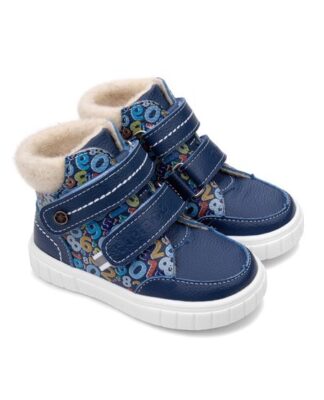 Утепленные ботинки на осень, тёплую зиму или весну для маленьких мальчиков на подкладке из шерстяной байки. Выполнены из натуральной кожи синего цвета с разноцветным ярким принтом. Современная, устойчивая, упругая и эластичная подошва позволяет повторить естественное движение стопы при ходьбе для правильного распределения нагрузки на опорно-двигательный аппарат ребенка. Многослойная съемная стелька с небольшим мягким подсводником и подпяточником для правильного формирования стопы. Использование современных внутренних материалов позволяет оптимально распределить нагрузку по всей площади стопы и свести к минимуму ее ударную составляющую. Задник средней жесткости. Два ремешка с липучками позволят подогнать ботинки по полноте. Подкладка из шерстяной байки поддерживает комфортную температуру внутри обуви при погодных условиях от +5 до -5 градусов. Ботинки украшены металлическим логотипом и светоотражающей тесьмой.